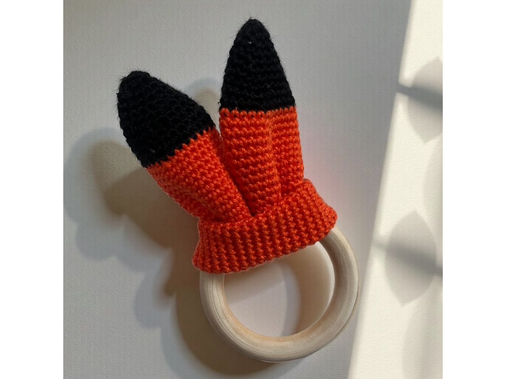 - Kousátko s oušky - dřevěný kroužek s háčkovanými oušky, které pomáhají při prořezávání zoubků