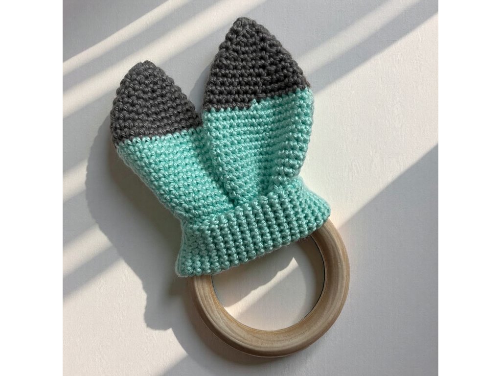 Kousátko s oušky – dřevěný kroužek s háčkovanými oušky pro úlevu při prořezávání zoubků
