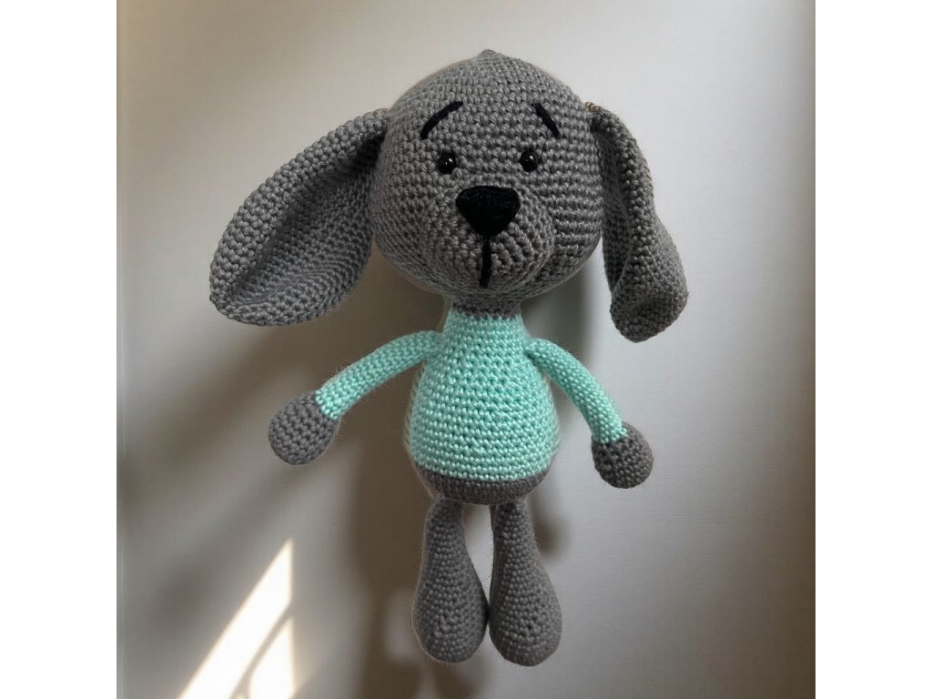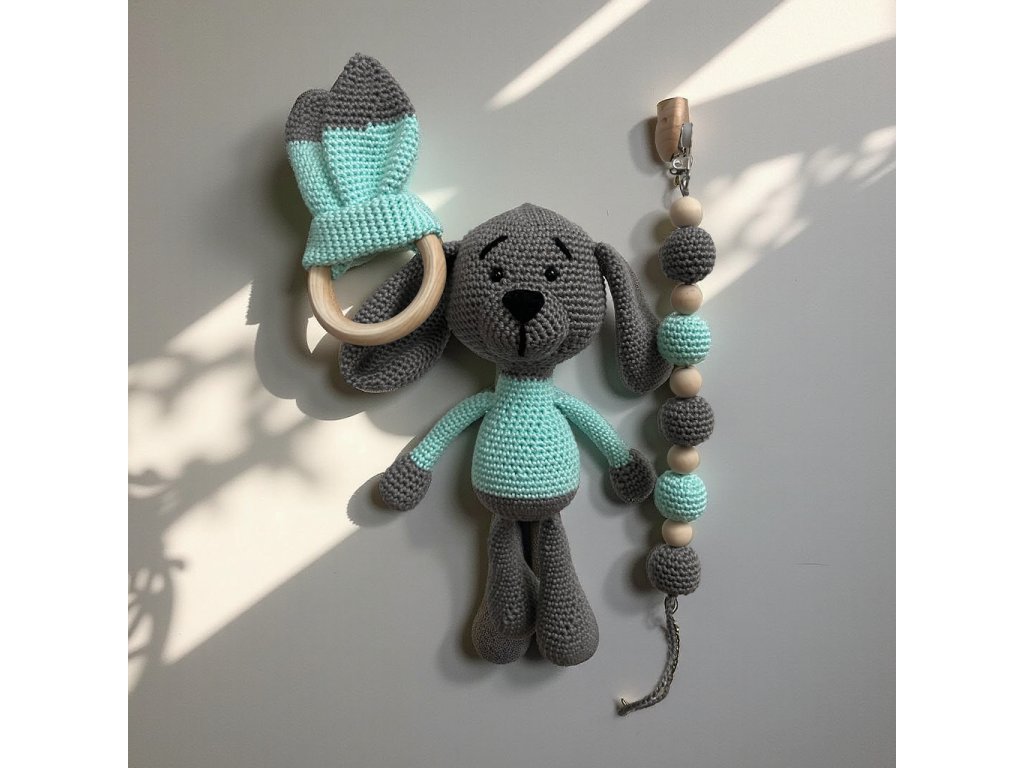 Mazlivý set s háčkovaným pejskem v jemných barvách. Tři ručně vyráběné kousky, které udělají radost miminku i rodičům – ideální do výbavičky nebo jako milý dárek.